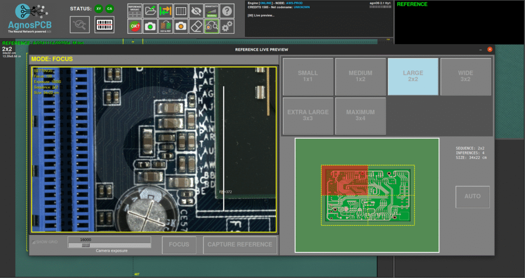 Acquisisce una foto di un PCBA/pannello dell’unità in ispezione. Se il pulsante di elaborazione automatica è attivo, l’ispezione si avvierà automaticamente una volta scattata l’immagine UUI. Questa funzione può essere attivata premendo il tasto S della tastiera.