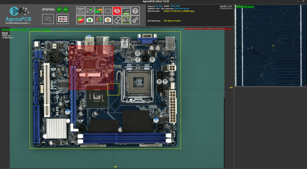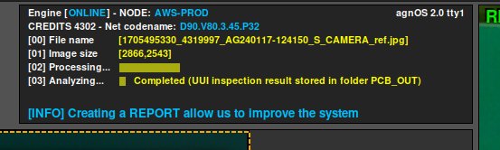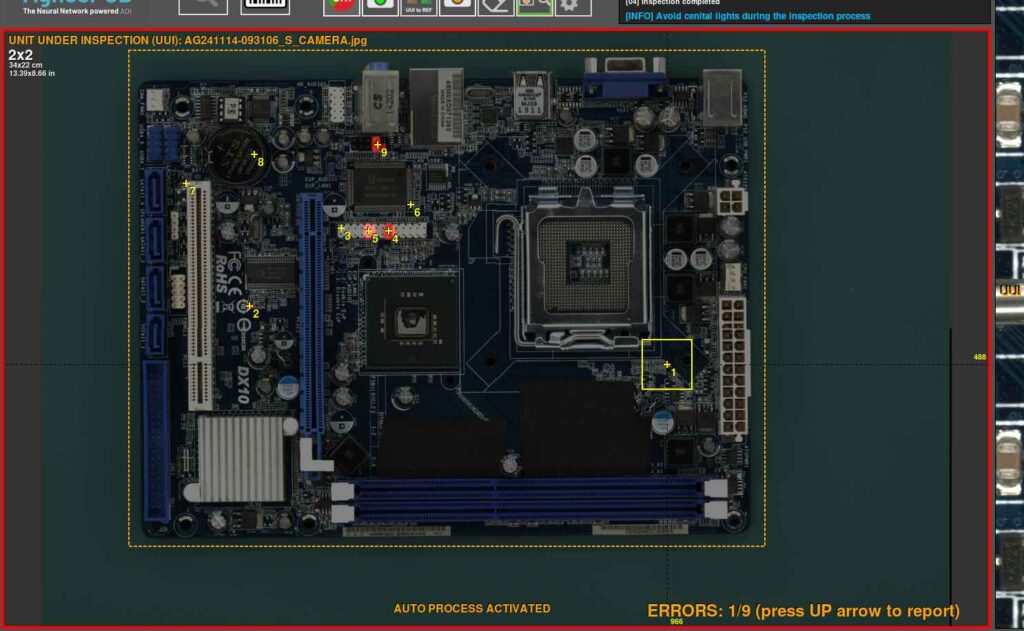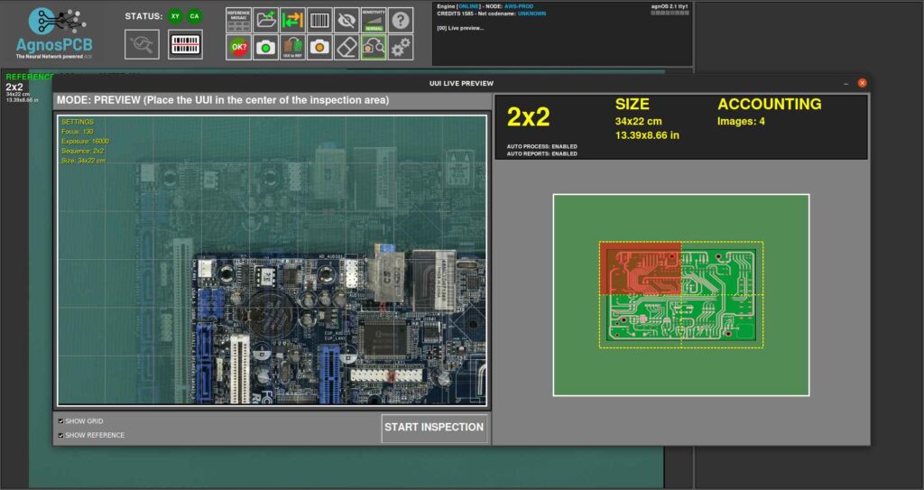 Il pulsante Avvia ispezione si trova nell’angolo in alto a sinistra. Un semplice clic attiva una sequenza di azioni per ispezionare l’immagine dell’UUI corrente. Questo pulsante è disponibile quando il pulsante Elaborazione automatica è disattivato. Questa funzione è utile per evitare di spendere crediti quando si testano le modalità di acquisizione delle immagini dei PCBA.