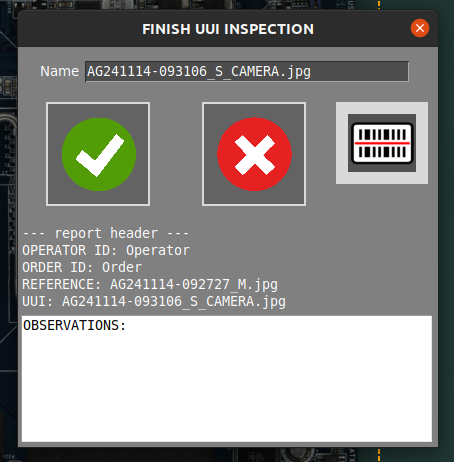 Selezionando questo pulsante verrà creato un report che include gli errori rilevati. Questo report può essere contrassegnato come ispezione OK o NON OK, a seconda dei criteri di produzione.