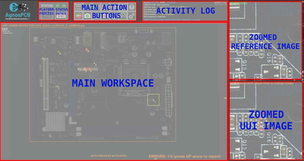 L’immagine seguente descrive le principali aree di lavoro del software di ispezione AgnosPCB.